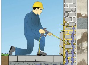 Brugger AG Mann mit blauer Arbeitskleidung und gelben Helm injiziert Dichtmittel in untere Kellerwand für Horizontalsperre
